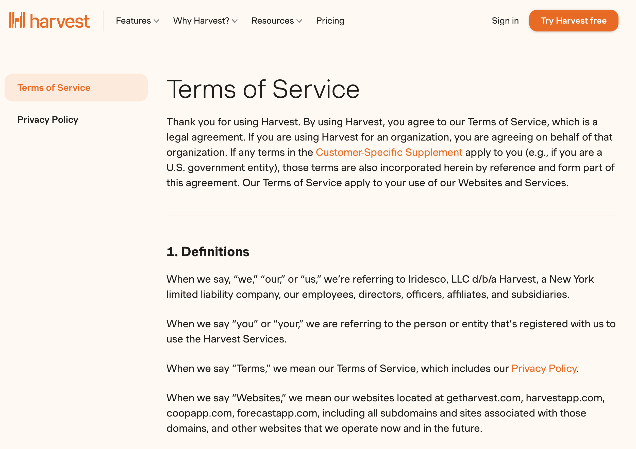 One of my favorite examples is Harvest’s Terms & Privacy Policy: